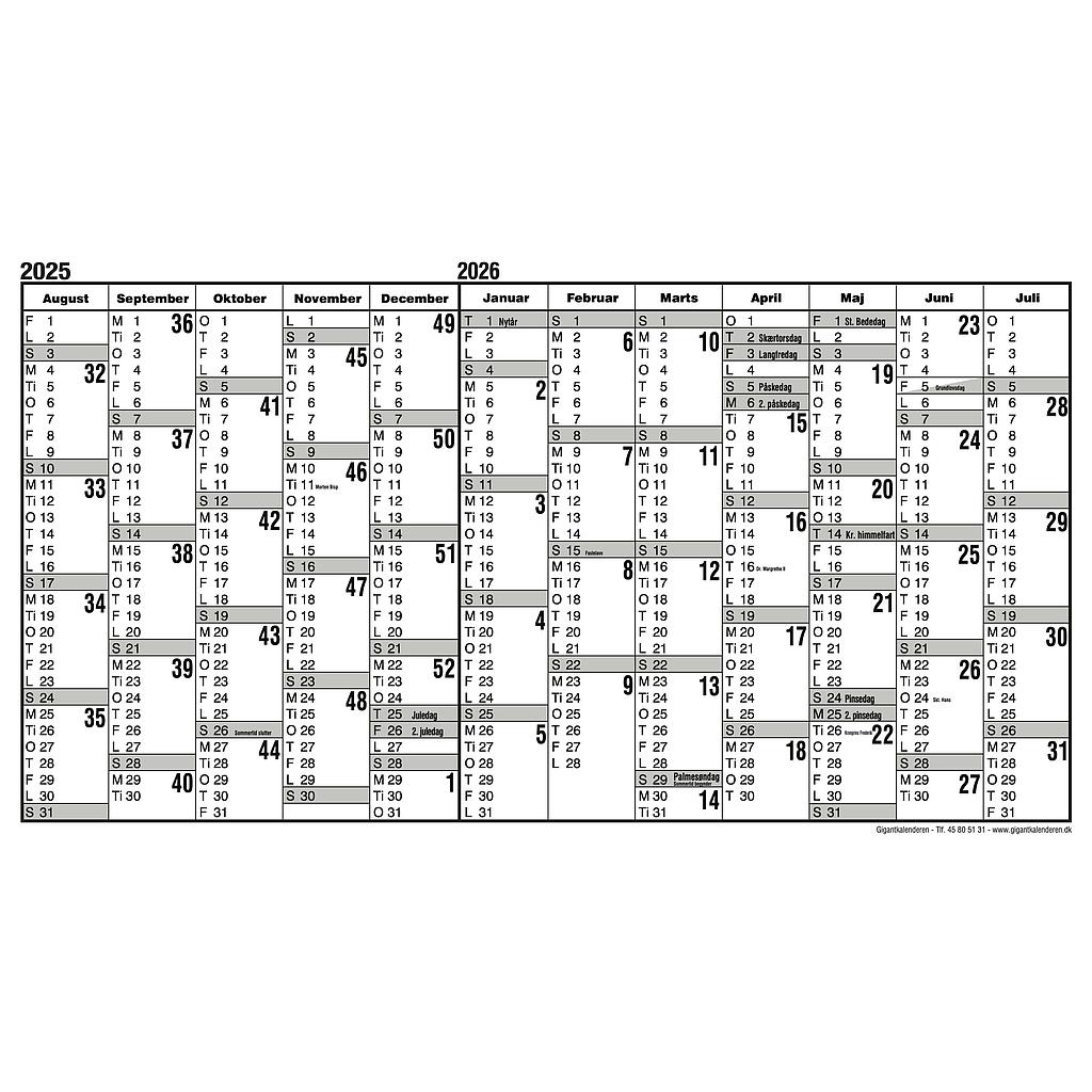 Gigantkalender i kraftig kvalitet som måler 122 x 68 cm. Kalenderen følger skoleåret 2025-2026. Kalenderen er udført i kraftig PVC, og har en vaskbar overflade. Der kan tilkøbes rammer, samt diverse tilbehør til kalenderen.